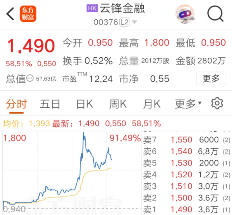 今天,港股耀才证券金融(下称“耀才证券”)一度涨超96%。随后,港股阿里概念股持续走强融证通,云峰金融一度大涨超91%,中国动向涨超14%,高鑫零售、亚博科技控股跟涨。